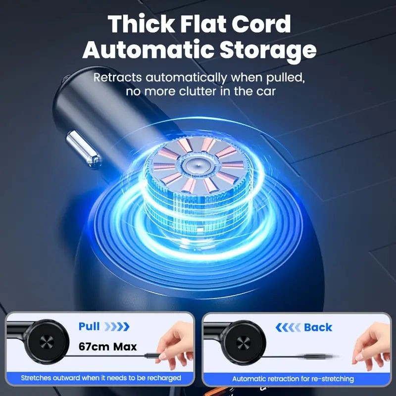 The EVO-CHARGE Model-C1 Retractable Car Charger 3-in-1 is a powerful, space-saving charging solution that delivers up to 78W total output for fast and efficient charging on the go. Featuring: