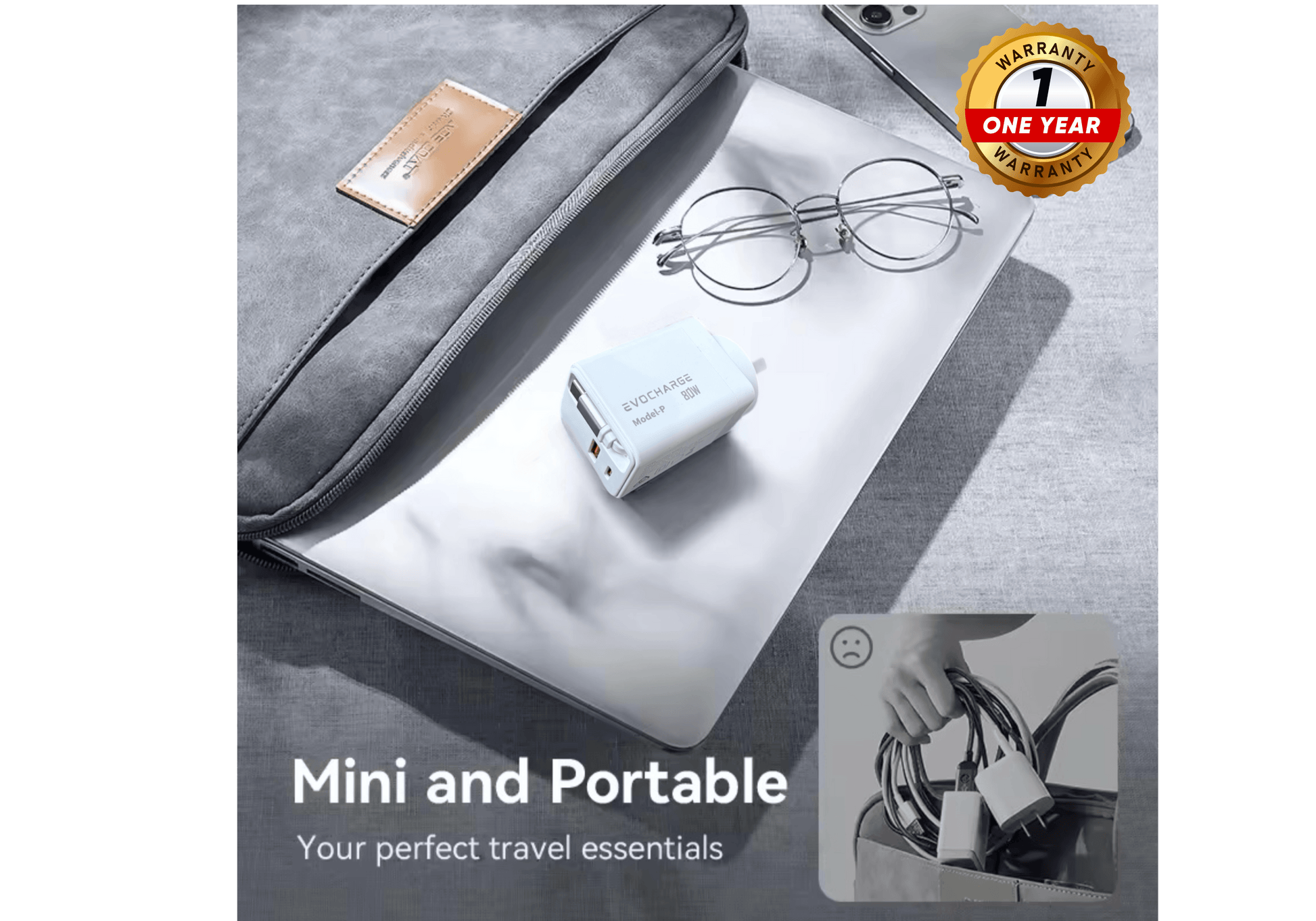 Considerably smaller than standard 80W chargers, crafted for an easy grip and minimal footprint. - 1 Year Warranty