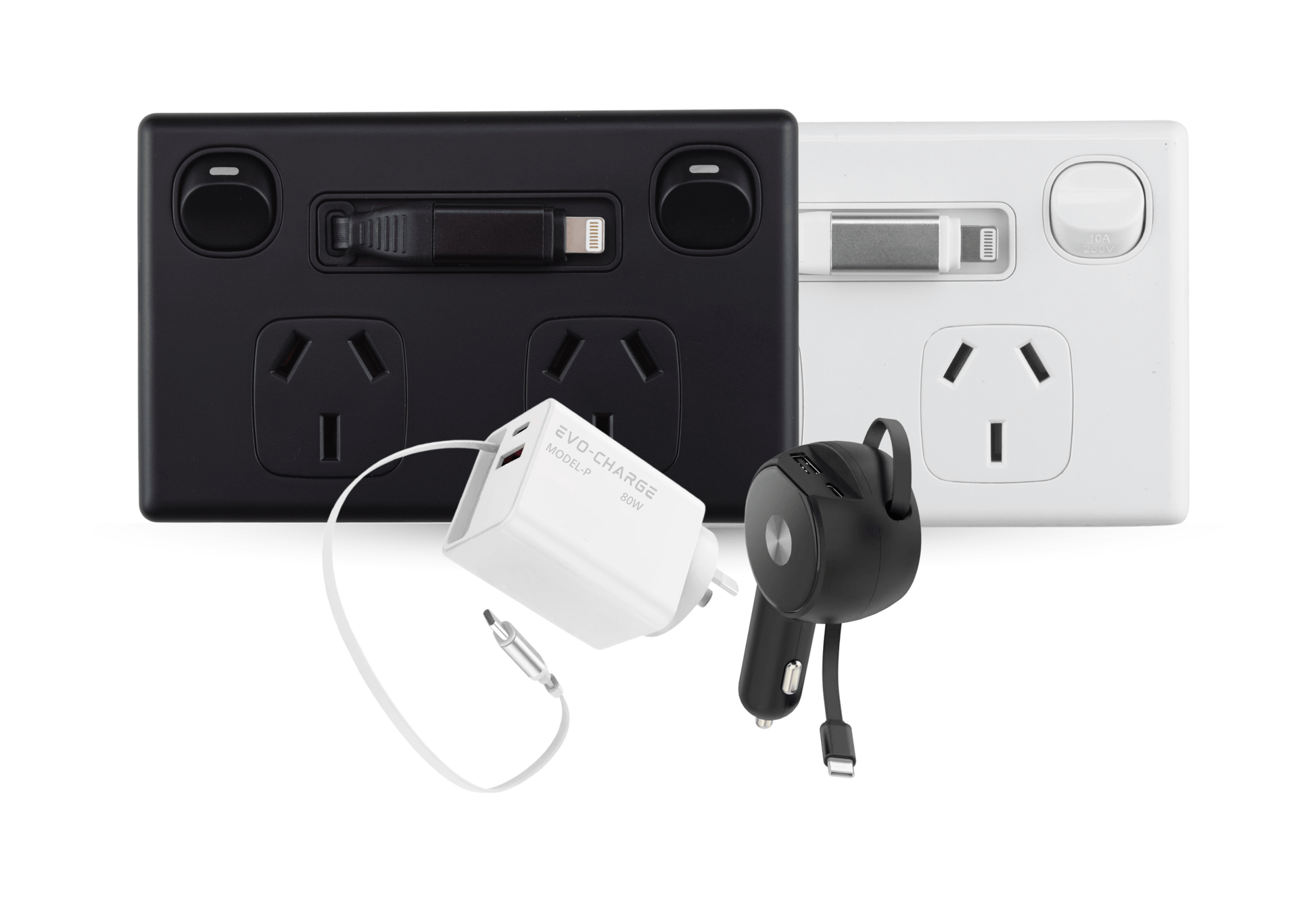 This Bundle includes x2 Evo-charge model 1 powerpoints (colour of your choice), plus a free Evo-charge Model-P charging block & a free Evo-charge Model-C1 car charger.